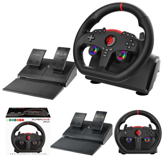Odkryj nowy wymiar grania dzięki kierownicy gamingowej z pedałami i podświetleniem LED RGB. Wyposażona w podwójne joysticki z programowalnym podświetleniem, oferuje niesamowite możliwości personalizacji i komfort sterowania. Duża średnica kierownicy (27 cm) i kąt obrotu 270° gwarantują realistyczne wrażenia podczas prowadzenia. Dodatkowo system progresywnego przyspieszania i hamowania z LED-owym wskaźnikiem zapewnia intuicyjną kontrolę nad pojazdem. Wbudowana funkcja wibracji sprawia, że każda trasa nabiera realizmu, a Ty poczujesz się jak na prawdziwym torze wyścigowym.